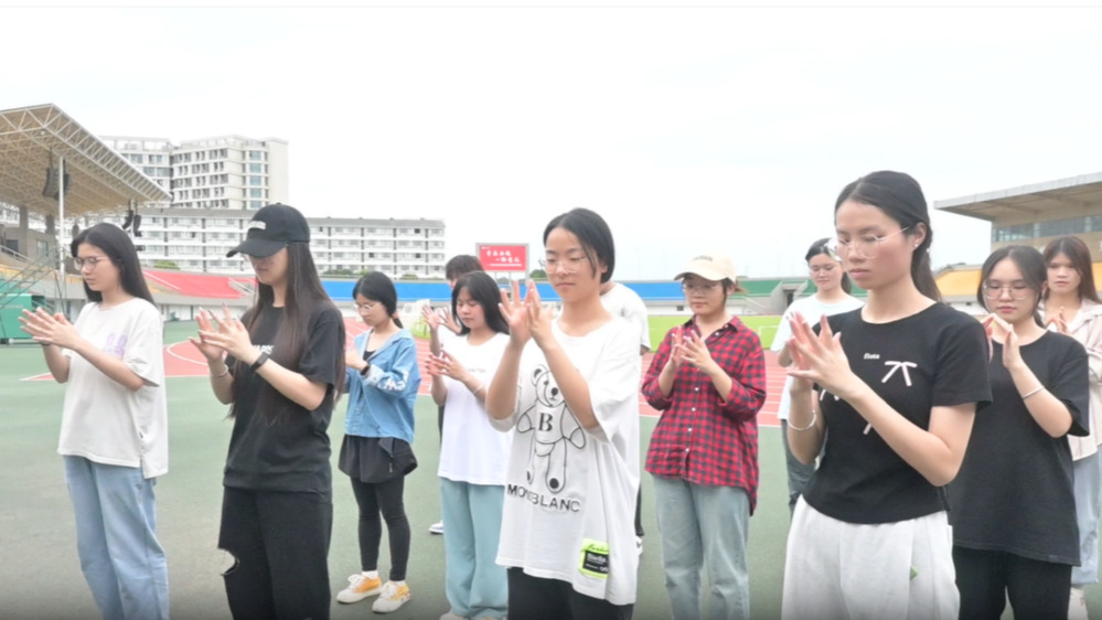 7月15日的下午两点,在东校区的操场上,团队成员们排成方阵练习着手部动作——手指操,五根手指的指尖依次相抵。以便能更好的教授给社区里的中老年人。
