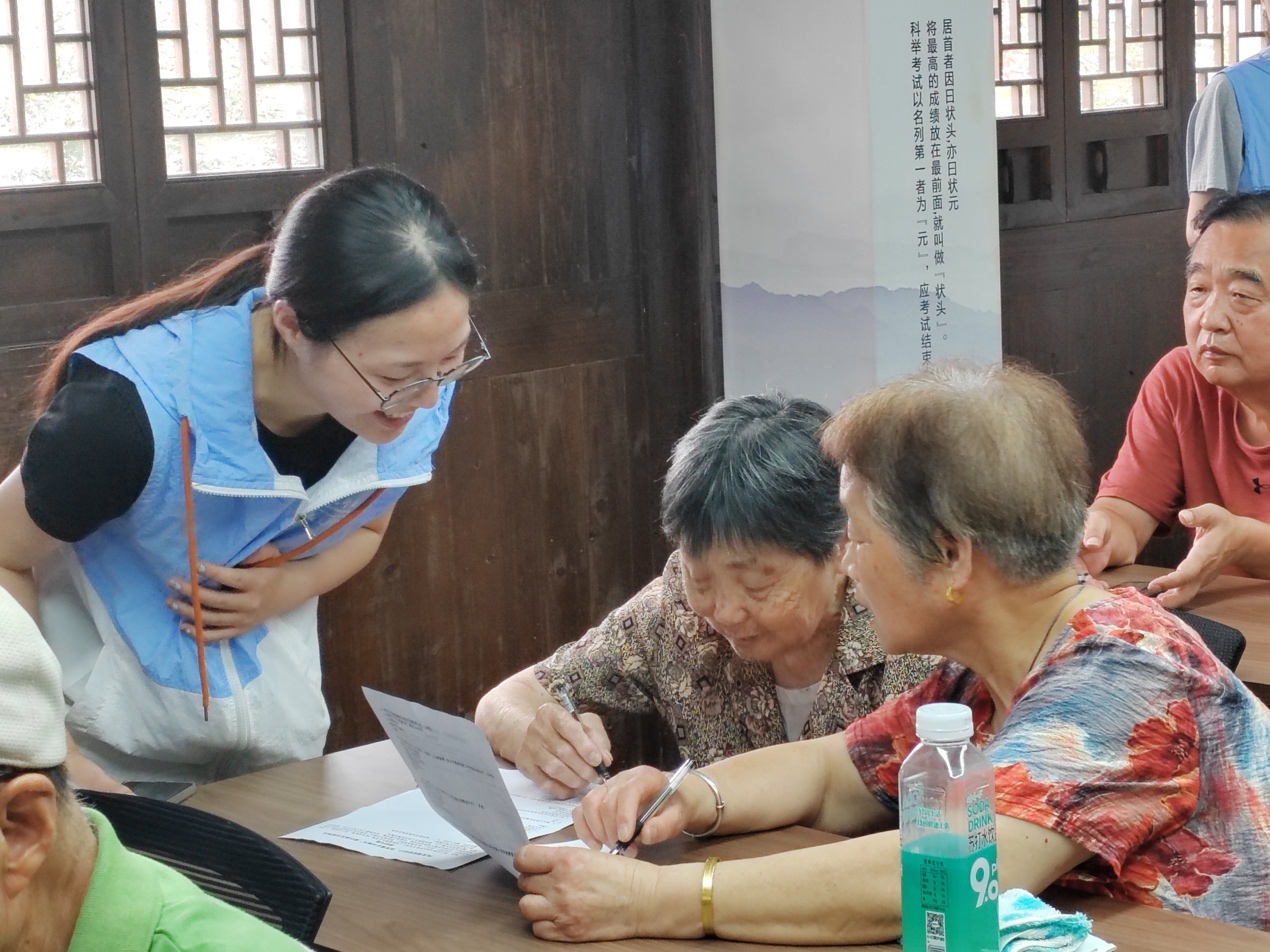 湖州市吴兴区潞村,团队成员李佳同学在潞村纪念馆向潞村的村民们宣传心理健康知识,并邀请潞村村名填写心理健康问卷,村民认真听取了李佳同学的讲解。