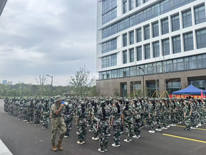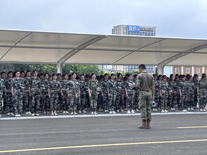 教官在迷彩方阵前,手持扩音设备指挥。周围的建筑与树木环绕,学生们认真听从,保持着整齐的队列。每一个学生都在专注于指令,在这样的训练场景中,他们的纪律性与执行力得以体现。