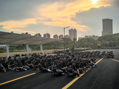 夕阳西下,队伍中的战士们席地而坐休息。历经训练,他们难掩疲惫,却仍带着青春的鲜活劲儿,彼此间似有轻松交流,氛围惬意又充满朝气。