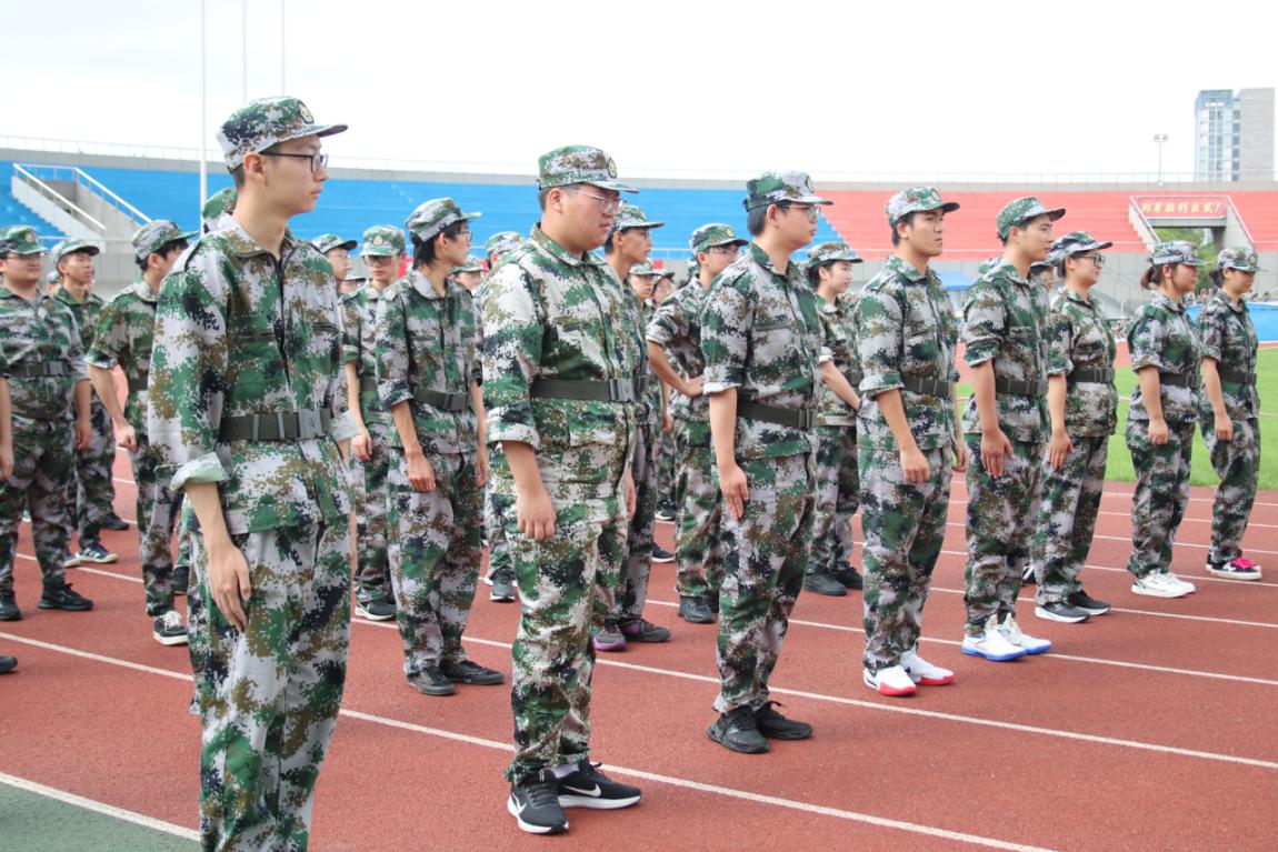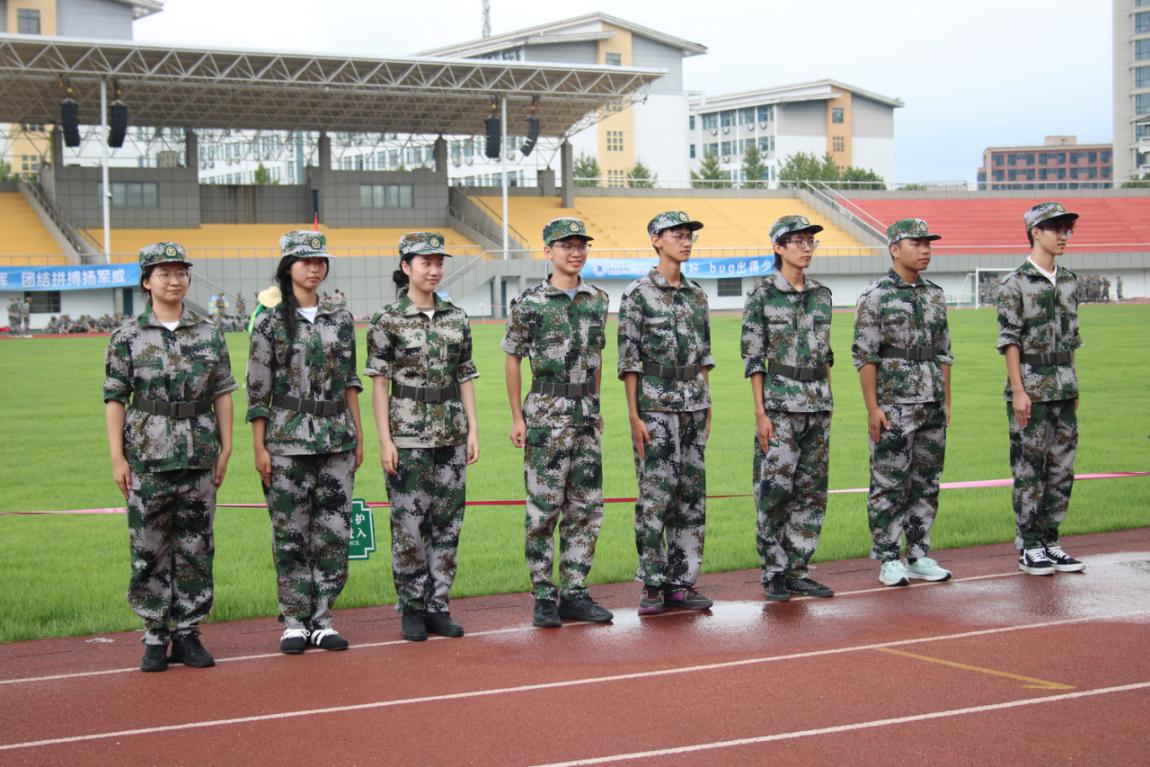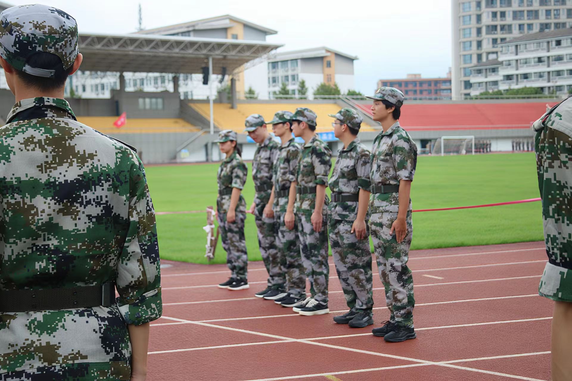 在红色跑道上,几名身着迷彩军训服的学生整齐列队。他们身姿挺拔,听从着指挥员的号令。背景是黄绿红相间的看台与错落的教学楼,他们在军训中展现出的专注与纪律,为这片校园场地增添了青春磨砺的色彩。