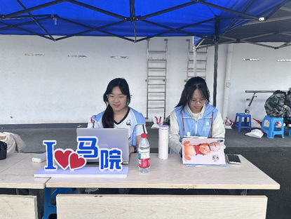 2.军训期间,两位身着蓝白志愿者马甲的女生在蓝色帐篷下的桌前,低头准备服务新生的注意事项,并时刻关注新生的动态,她们以细致服务为军训工作保驾护航。
