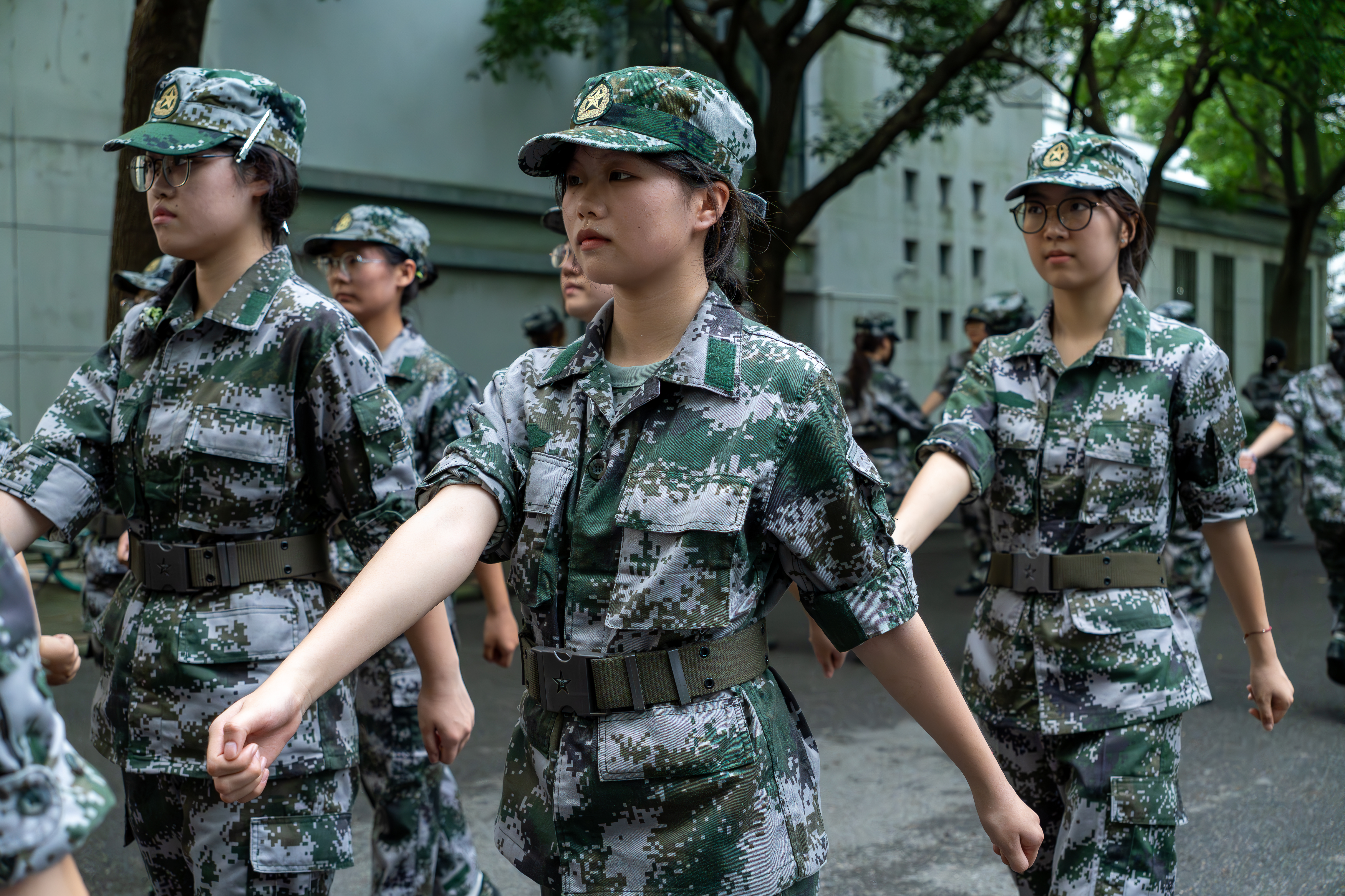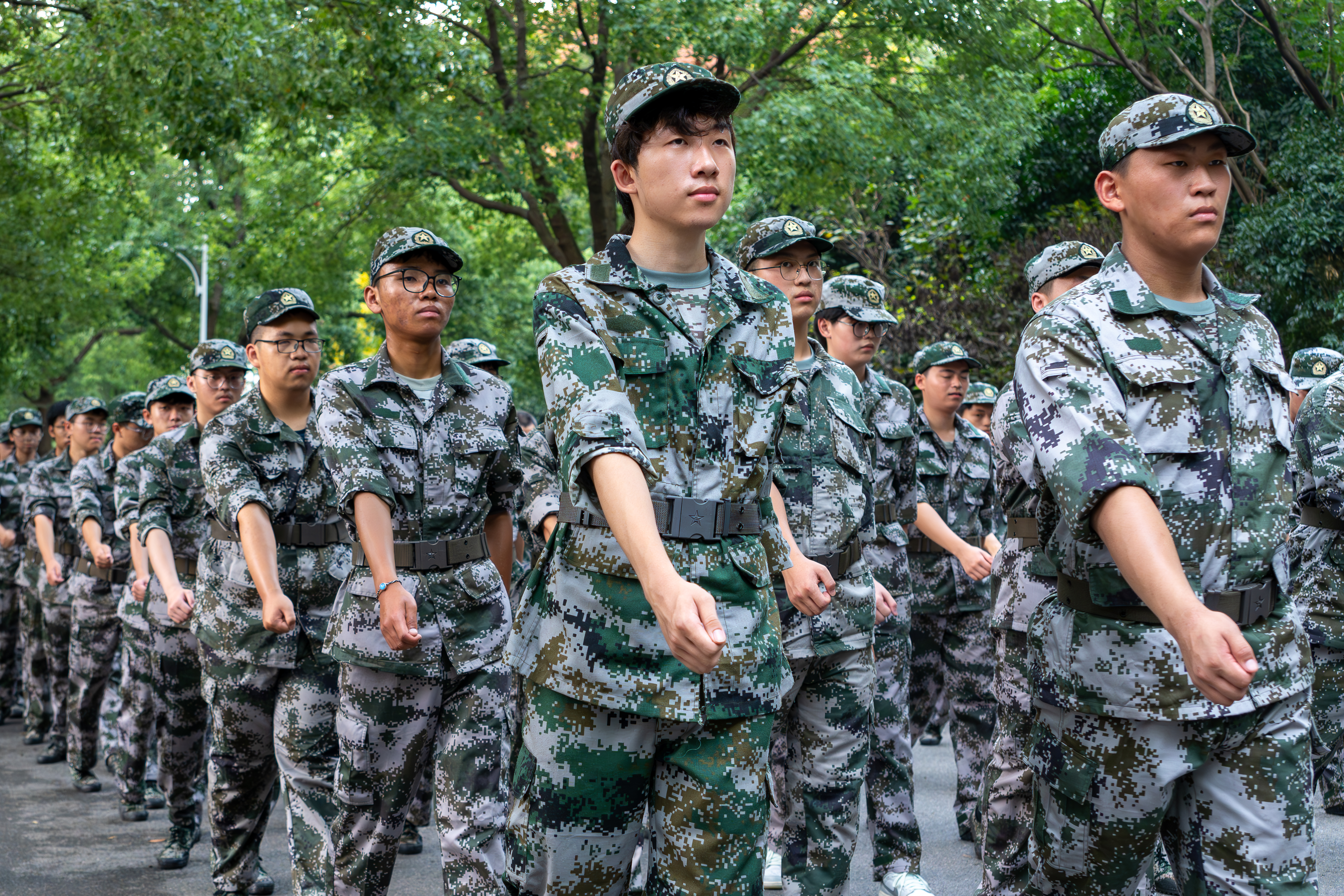 3.林荫道上迷彩涌动,学子们列队行进神情专注。阳光透过枝叶洒在年轻的脸庞上,整齐步伐踏出大学第一课的责任与担当。