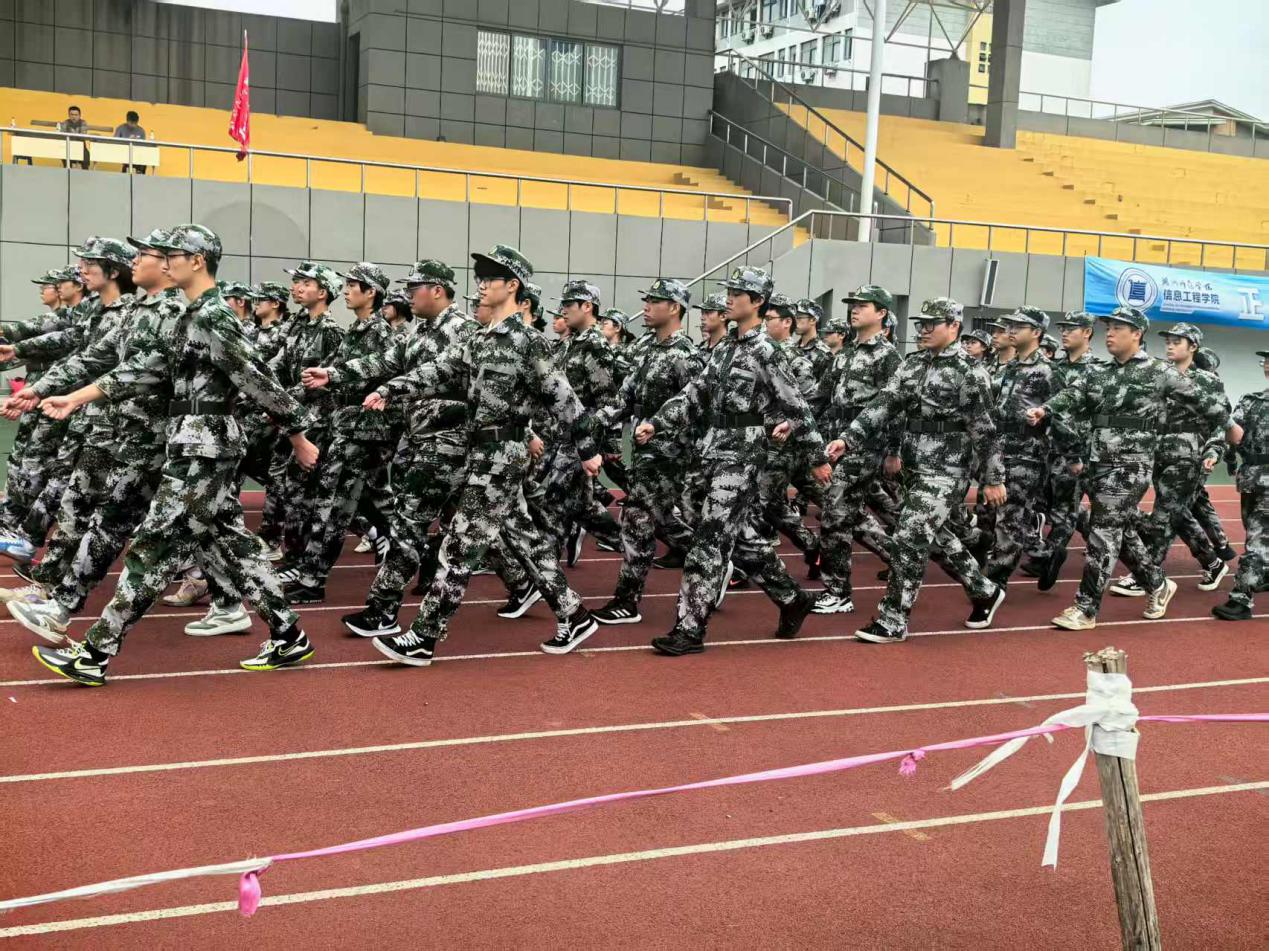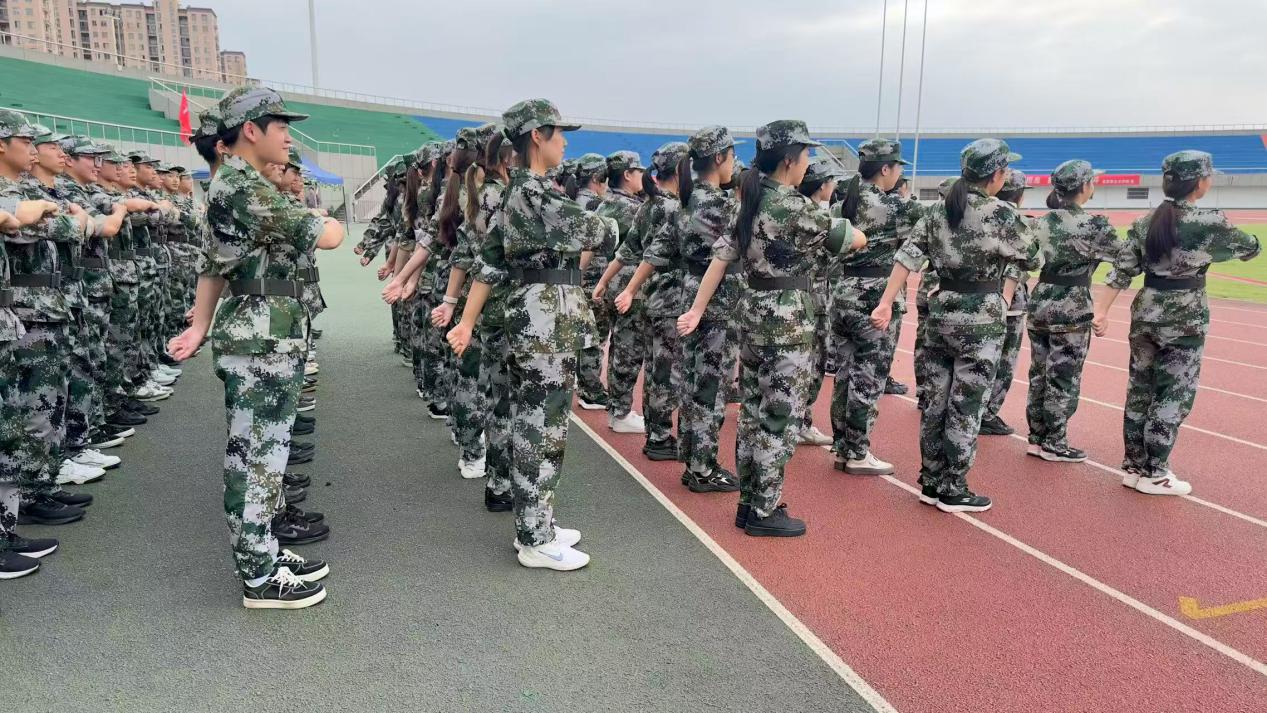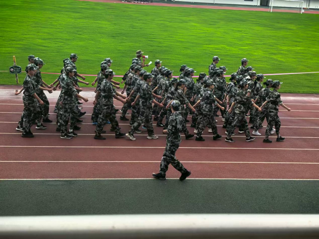 操场上,一群身着迷彩服的十三营新生们整齐列队,正认真进行军训训练。他们身姿挺拔,动作一致,展现出青春的朝气与纪律的严明,背景中的场馆设施,为这充满活力的军训场景增添了几分校园氛围。