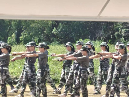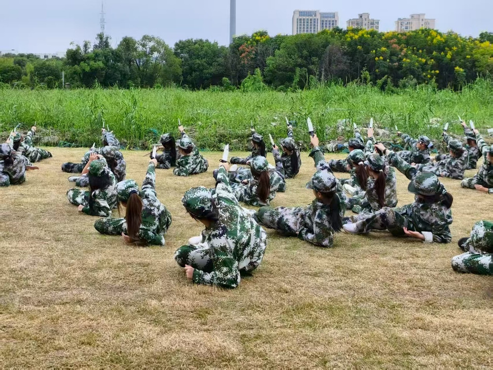 在草地上,身着迷彩服的学子们正开展着军训匕首操训练。他们动作整齐,在绿意与建筑的背景下,尽显青春朝气与坚毅,是校园军训中一抹飒爽的风景。