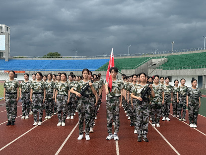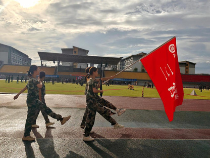 2.阳光洒在操场上,马院的新生举着院旗,迈着有力的正步向前走。汗水或许浸湿了迷彩服,但他们脸上透着一股不服输的劲儿,这面红旗在阳光下飘扬,也见证着他们的成长与蜕变。