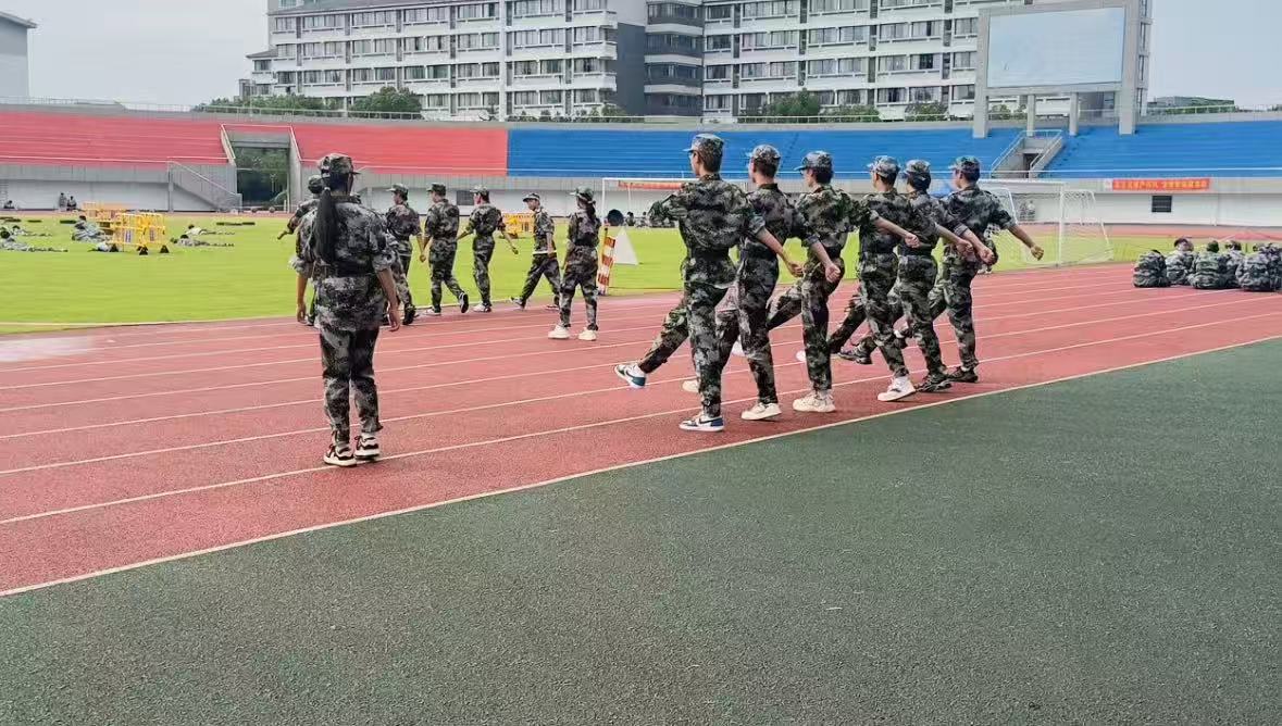操场上,一群身着迷彩服的二连新生们在跑道上进行军训踢正步训练,动作整齐。周围还有其他新生们刻苦训练,背景是色彩鲜明的看台与教学楼,洋溢着青春朝气。
