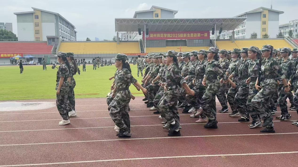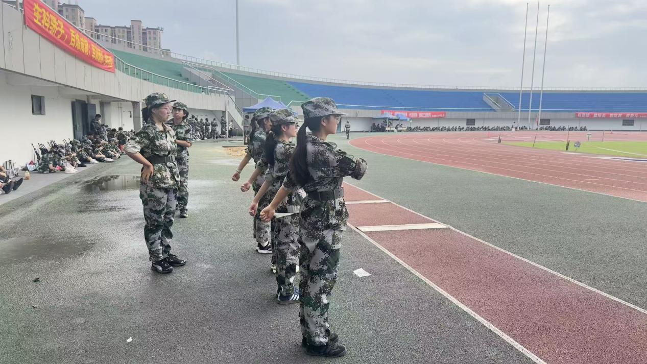 操场上,十三营三连的新生们刻苦训练,整齐划一地列队练习踏步走,动作整齐、流畅、一致。背景看台色彩鲜明,洋溢着青春与纪律的氛围。