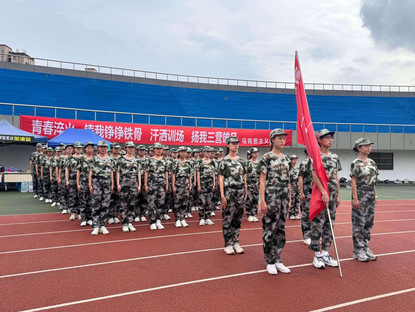 2.新生们身着迷彩,似棵棵挺拔的青竹,在训练场整齐行进。红旗猎猎招展,他们步伐刚劲有力,青春的蓬勃与钢铁般的意志交相辉映,绘就军训场上热血又动人的图景。