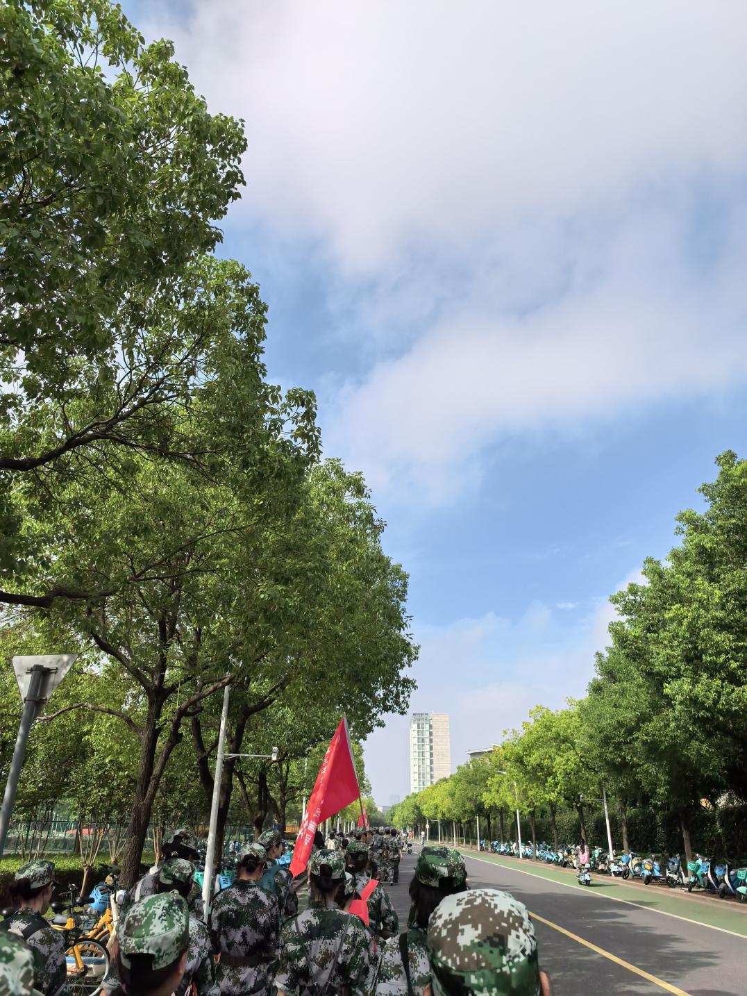【理学院】【五连】湖州师范学院的道路被浓绿的树木簇拥,澄澈蓝天缀着轻柔云絮。军训学子们身着迷彩,迈着整齐有力的步伐,如一条翠色长河蜿蜒向前,红旗在队伍中猎猎招展,他们昂首挺胸,将青春的朝气与拉练的坚毅,都融在这明媚的光景里。