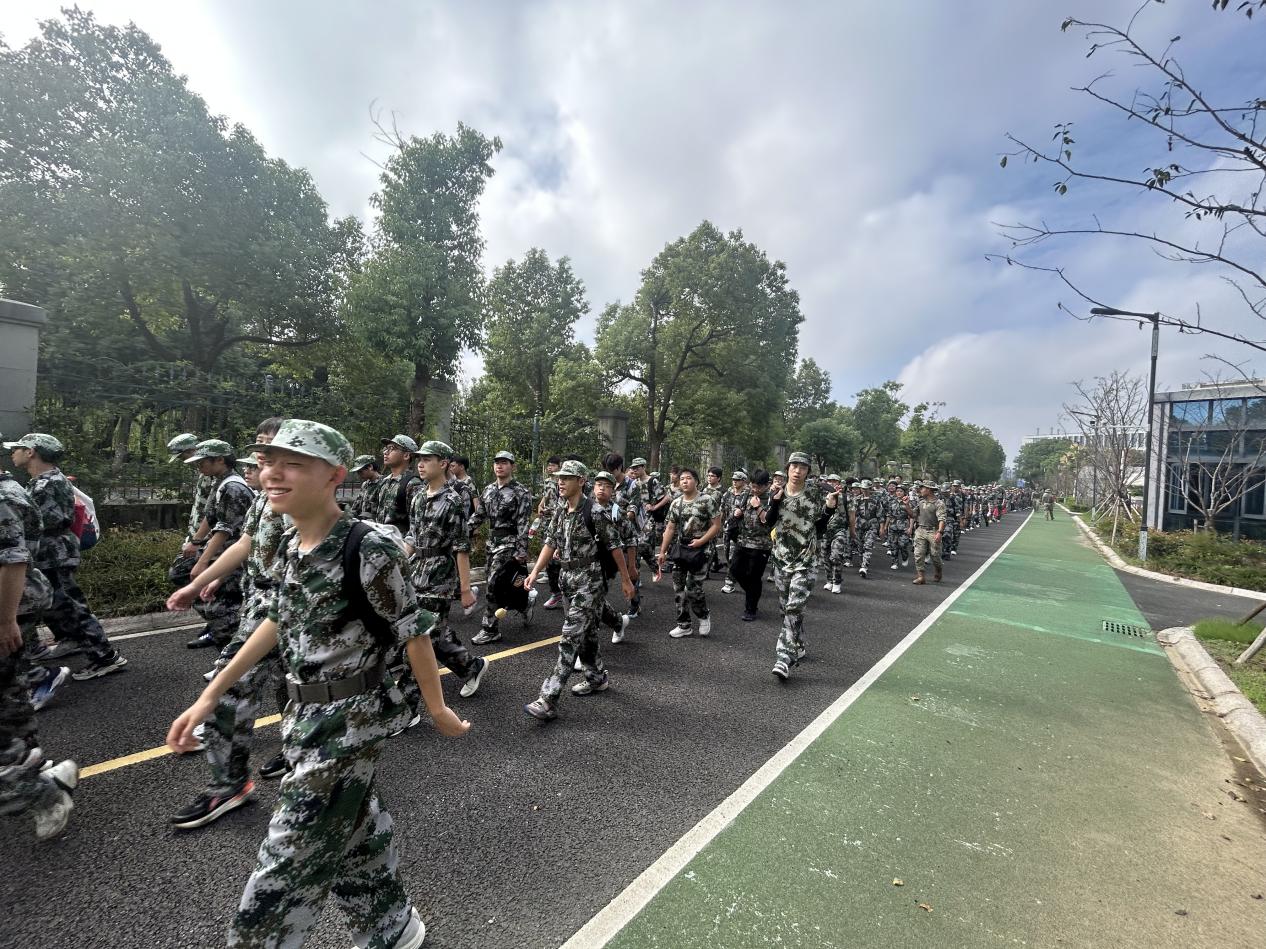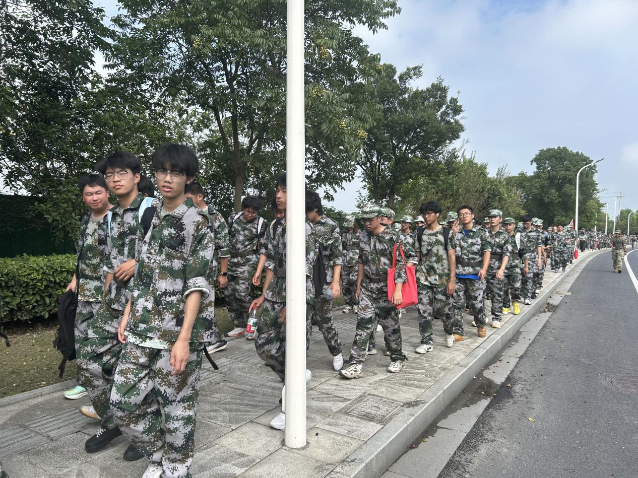 【理学院】【一连】湖州师范学院的人行道旁,树木葱茏,绿意盎然。身着迷彩服的学子们组成长长的队伍,正行进在军训拉练途中,有的背着包,有的手持物品,步伐虽显疲惫却依旧整齐,洋溢着青春的朝气与坚韧。