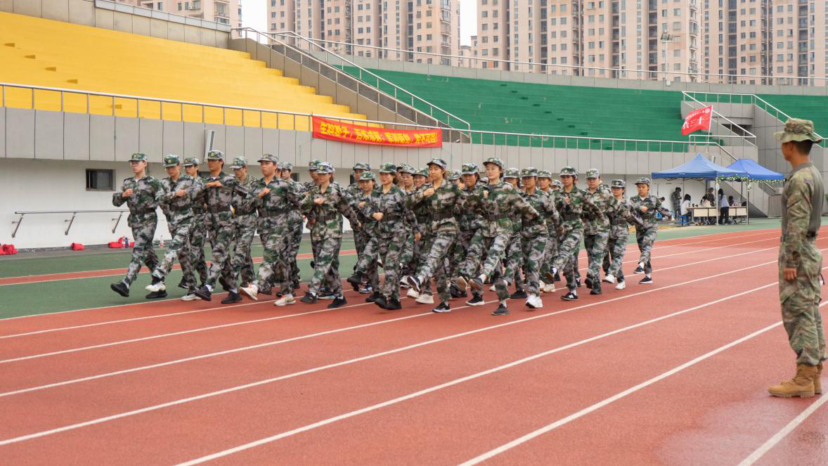 生科学子身着迷彩服组成方阵,在红色跑道上整齐行进。一旁有教官注视指导,背景是黄绿相间的看台和林立的高楼,经过数日打磨,方阵步枪寒光连成直线,脚步声与摆臂声韵律统一,排面误差控制在3厘米内,尽显训练成效。