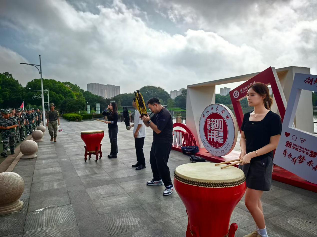 几位表演者在户外进行文艺展示,有的敲击红色大鼓,有的演奏乐器。一旁有身着迷彩服的军训方阵正整齐行进,背景可见“湖州师范学院”的标识景观,还有绿树、高楼与多云的天空,展现出军训期间校园里文艺与训练交融的场景。