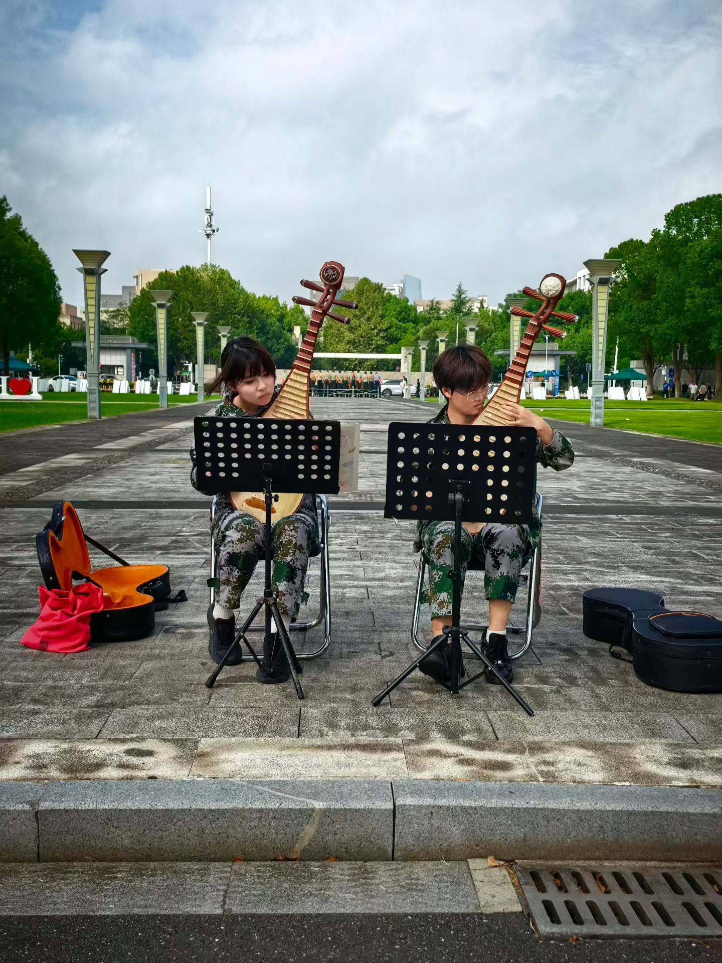 两位学子身着迷彩服,在校园的石板路上端坐于折叠椅上,专注地弹奏琵琶。她们面前立着乐谱架,身旁放着乐器箱,背景是绿树成荫的校园景致,还有远处的建筑与人群,展现出军训期间别样的文艺风采。