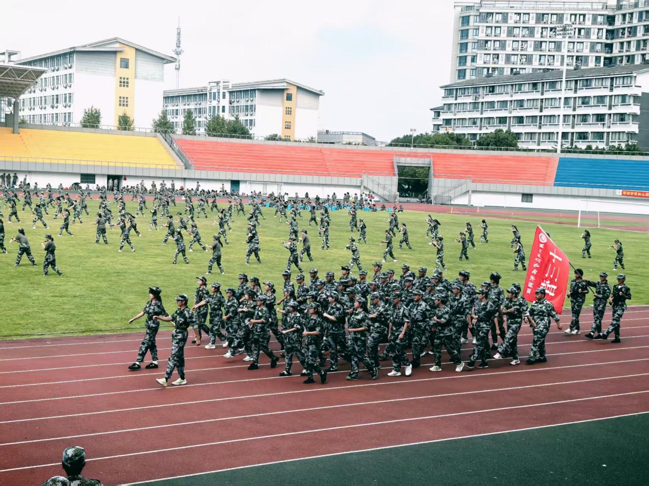 湖州师范学院的操场上,身着迷彩服的学生正进行军训队列训练。有的队伍举着红旗行进,步伐整齐,周围还有学生观摩,洋溢着青春活力与纪律感。