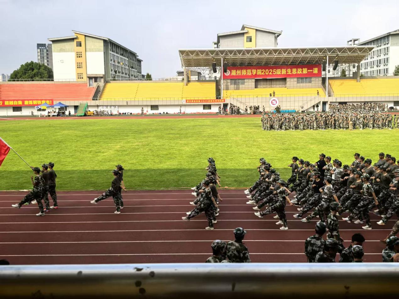 湖州师范学院操场上,2025级十三营新生们身着迷彩服军训。跑道上队伍踢正步,动作整齐,背景有“思政第一课”横幅,洋溢青春朝气与纪律感。