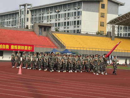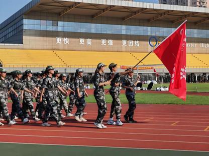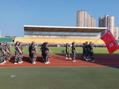 1.操场上,新生军训方阵正迈着整齐的步伐行进。迷彩服在红色跑道上格外醒目,前方红旗引领,背景是色彩鲜明的看台与写着“超越自我,磨炼钢铁意志”的横幅,楼宇矗立,尽显青春磨砺的飒爽与朝气。