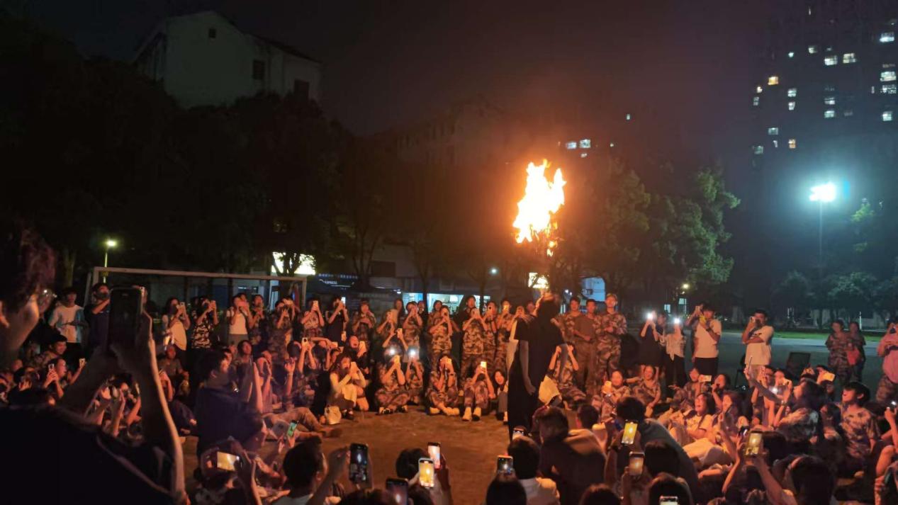 【理学院】【一连】军训最后一晚,空旷的场地中央,表演者登场。只见他深吸一口气,猛地喷出,熊熊火焰骤然腾起,如火龙般蹿向夜空。周围理学院学子瞬间沸腾,或惊叹欢呼,或举起手机,屏幕的点点亮光与耀眼火光交相辉映,将这充满震撼与欢乐的时刻牢牢定格。
