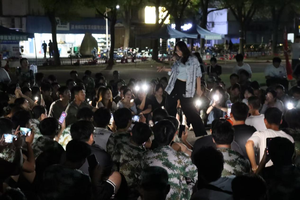 【理学院】【二连】军训最后一晚,夜色笼罩的场地里,一位同学自信地在人群中央起舞。周围的同学们纷纷打开手机闪光灯,星星点点的光亮如银河般环绕着舞者,将现场映照得既梦幻又热烈,为这段军训时光添上了难忘的一笔。