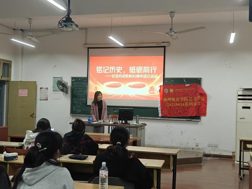 为深切缅怀革命先烈,弘扬伟大抗战精神,在2025年中国人民抗日战争暨世界反法西斯战争胜利80周年之际,湖州师范学院艺术学院20230614班团支部于10月15日晚,以线下形式开展“铭记历史,砥砺前行”主题团课,班级全体团员参与,团支书2023061408阚全博担任主讲人。