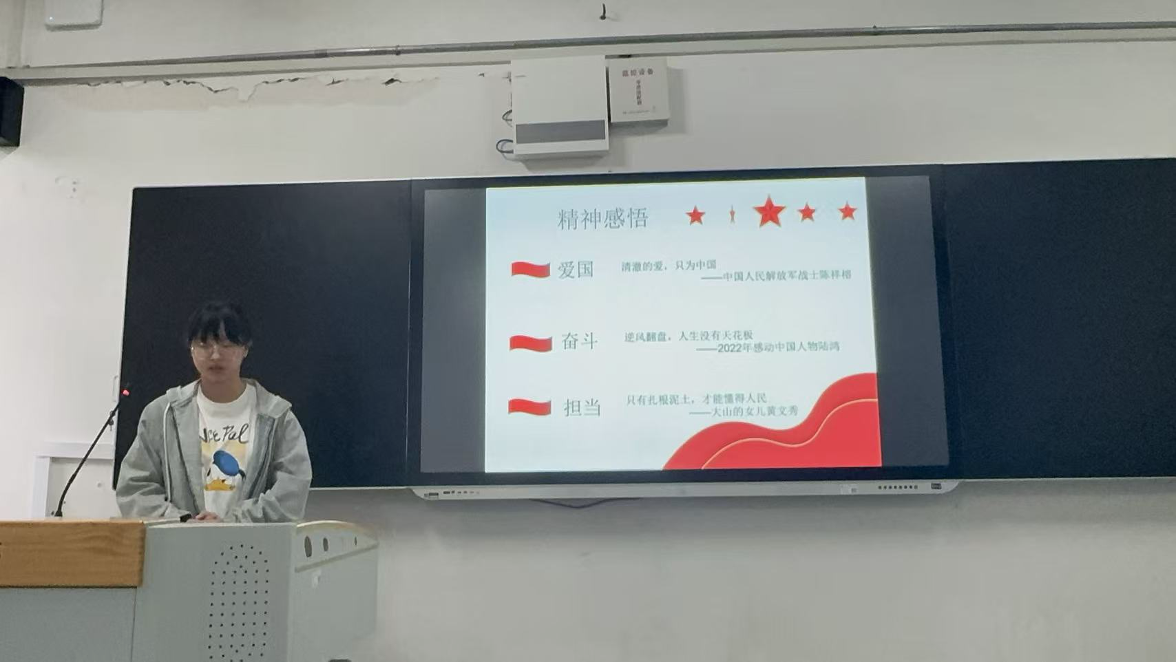 紧接着,活动围绕爱国、奋斗、担当三大维度,结合榜样事迹深化精神感悟。以中国人民解放军战士陈祥榕“清澈的爱,只为中国”的戍边信念诠释爱国赤诚;以2022年感动中国人物陆鸿“逆风翻盘,人生没有天花板”的奋斗故事激励学子在困境中勇毅前行;以“大山的女儿”黄文秀“只有扎根泥土,才能懂得人民”的奉献精神,引导青年在服务社会中践行担当。一个个鲜活榜样与真挚精神内核,为同学们树立了清晰的价值追求导向。