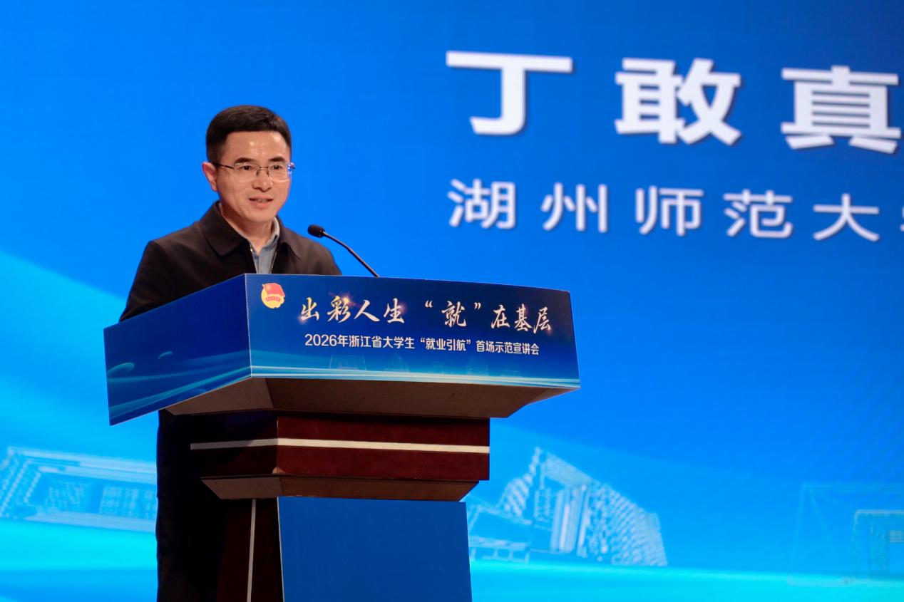 为深入学习贯彻习近平总书记关于促进高质量充分就业的重要指示精神,全面落实党中央、国务院关于促进高校毕业生就业创业的决策部署,帮助广大学生强化就业意识、做好职业规划、积极理性实现高质量就业,3月25日,“出彩人生‘就’在基层”2026年浙江省大学生“就业引航”首场示范宣讲会在湖州师范大学举办,活动由校团委、校友办承办。团省委学校部、省学联,团市委来校指导,校党委副书记丁敢真出席,学生处、校友办、团委相关负责人及800余名师生代表参加活动。